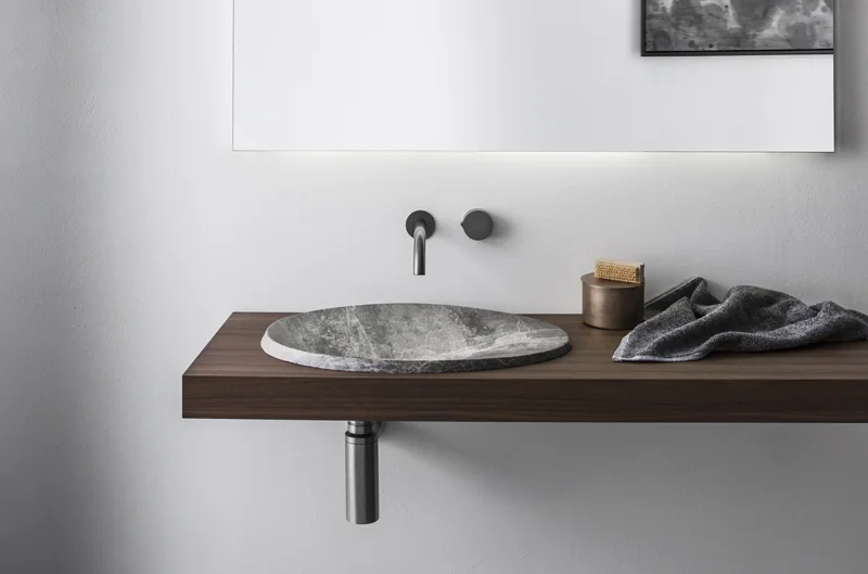 Comprising of an Oval and Rectangle shape basin, the organic forms are exmplified though a Bianco Carrara & Emperador Grey natural stone, and a proprietary Italian Ceramilux material.